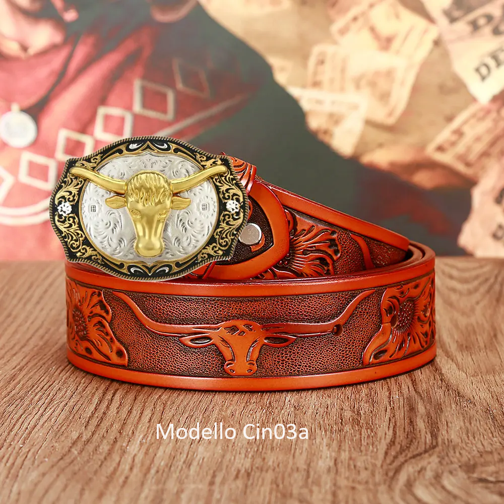 BISON DENIM cintura da Cowboy da uomo Longhorn Bull Pattern fibbia cinture incise in vera pelle floreale per uomo.